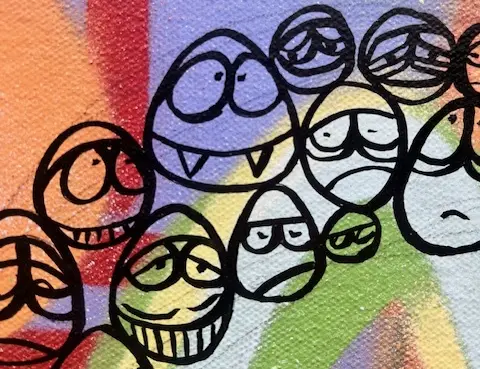 Parce que la peinture est son moyen d'expression, Guillaume a également construit son œuvre autour de l’expression pure plutôt que de la recherche esthétique. C’est à la suite d’un passage de vie compliqué qu’il a fait naître son univers singulier : les stanisafs. Ces visages minimalistes, tracés d’un seul geste et d’une seule couleur, émergent de fonds abstraits intensément colorés.